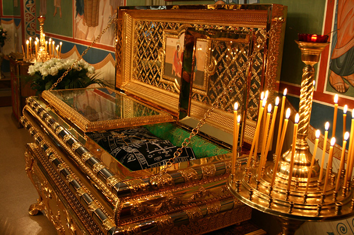 St. Theophilus reposed in Hermitage of Kytayevo and was buried near the Cathedral of St. Trinity. He was canonized in 1993 and at the same year his honorable relics were found and moved to the Cathedral. In 2009 the shrine with relics was moved to monastic church dedicated to honor of Twelve Apostles.